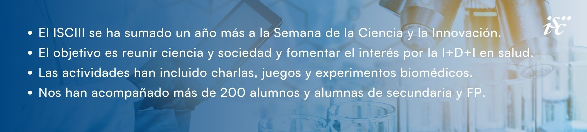 La Semana de la Ciencia en el ISCIII es una de las numerosas iniciativas de divulgación científica que organiza el Instituto a lo largo del año. La Unidad de Cultura Científica desarrolla diversas actividades en este sentido, abiertas al público general y/o enfocadas a centros educativos, ligadas a celebraciones como la Noche Europea de los Investigadores e Investigadoras, el Día de la Mujer y la Niña en la Ciencia y la Semana de la Administración Abierta, entre otras.
