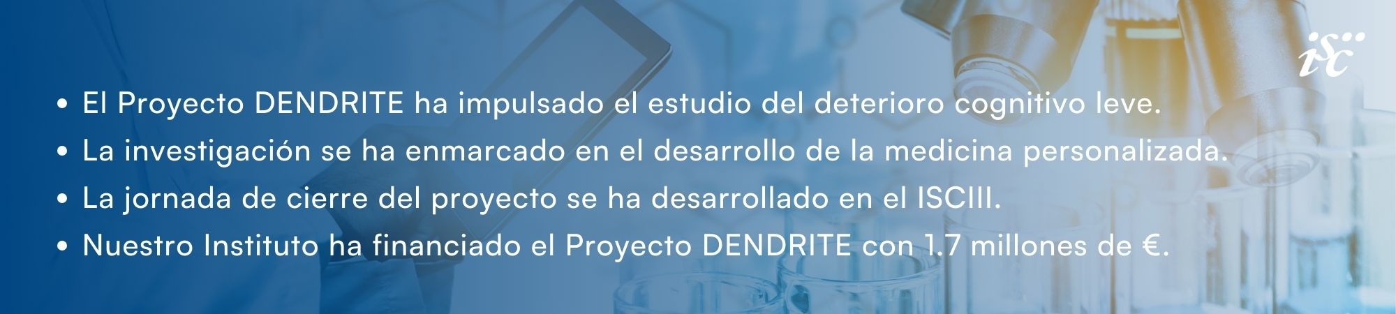 El Proyecto DENDRITE, una iniciativa de medicina personalizada orientada a la detección temprana del deterioro cognitivo leve, ha celebrado su jornada de cierre en el Instituto de Salud Carlos III (ISCIII) tras meses de investigación colaborativa. El objetivo principal del proyecto ha sido el establecimiento de un algoritmo predictivo capaz de identificar el riesgo de deterioro cognitovo leve en adultos de entre 55 y 70 años en fases muy tempranas, antes de que aparezcan signos clínicos evidentes de degeneración neuronal.