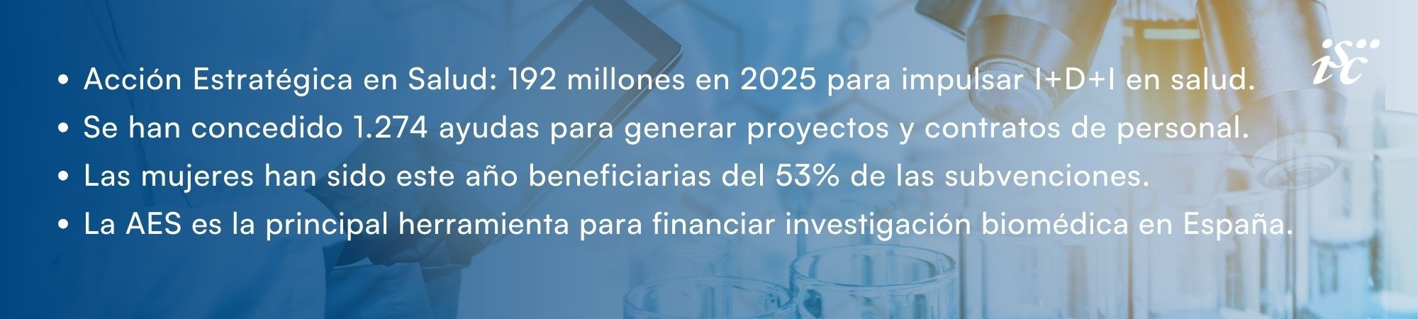 El Instituto de Salud Carlos III (ISCIII) cierra un nuevo año de concesión de subvenciones para impulsar la I+D+I biomédica y sanitaria en España, a través de la Acción Estratégica en Salud 2025 (AES 2025), la principal herramienta para financiar investigación en salud en España. La financiación total concedida por el ISCIII este año, como agencia financiadora dependiente del Ministerio de Ciencia, Innovación y Universidades, ha ascendido a casi 192 millones de euros.