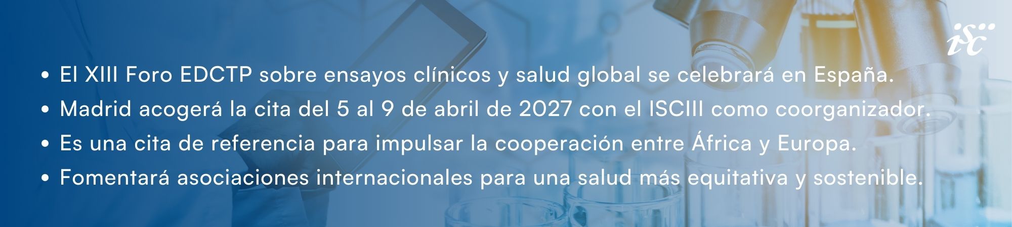 La 13ª edición del EDCTP Forum se llevará a cabo del 5 al 9 de abril de 2027, en el Palacio Municipal de IFEMA en Madrid. Se llevará a cabo bajo la coordinación del Instituto de Salud Carlos III (ISCIII), como organismo dependiente del Ministerio de Ciencia, Innovación y Universidades, y de la Fundación CSAI, como entidad dependiente del Ministerio de Sanidad.