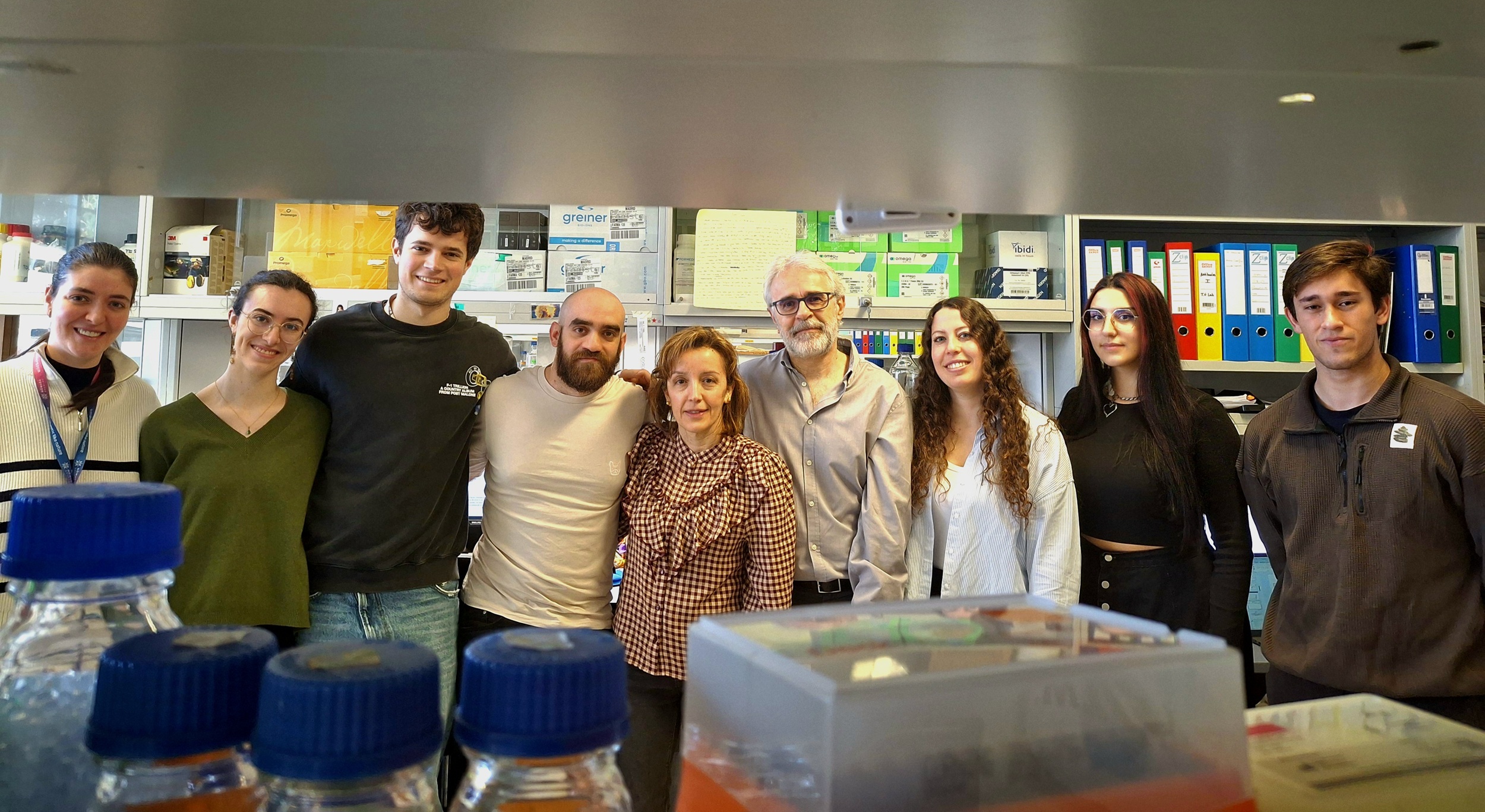 De izda a dcha: Mercedes Dessy (Investigadora postdoctoral), Mónica Ferreiro (estudiante de grado, TFG), Mario Santafé (estudiante de doctorado), Iván Hernández (técnico especializado), Maria Luisa Martínez (técnica superior especializada), Ignacio Pérez de Castro (Jefe del grupo de Terapia Génica del IIER-ISCIII, investigador científico), Déborah Gómez (investigadora postdoctoral), Paula Esteban (estudiante de doctorado) y Alfredo Corral (estudiante de grado, TFG).